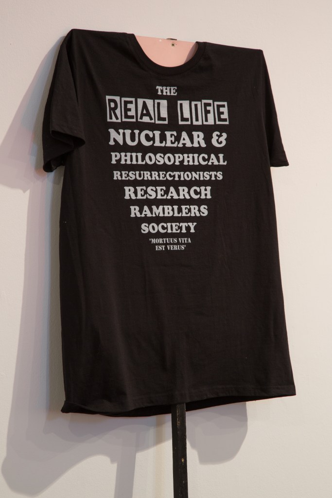 A series of T-Shirts are displayed announcing, ‘The Real Life Nuclear and Philosophical Resurrectionists Research Ramblers Society: Faslane & Coalport Chapter.’