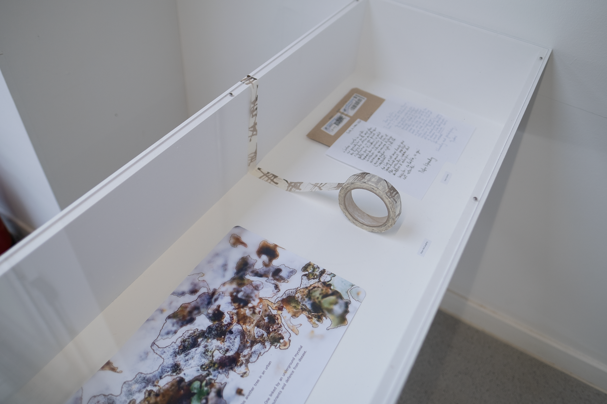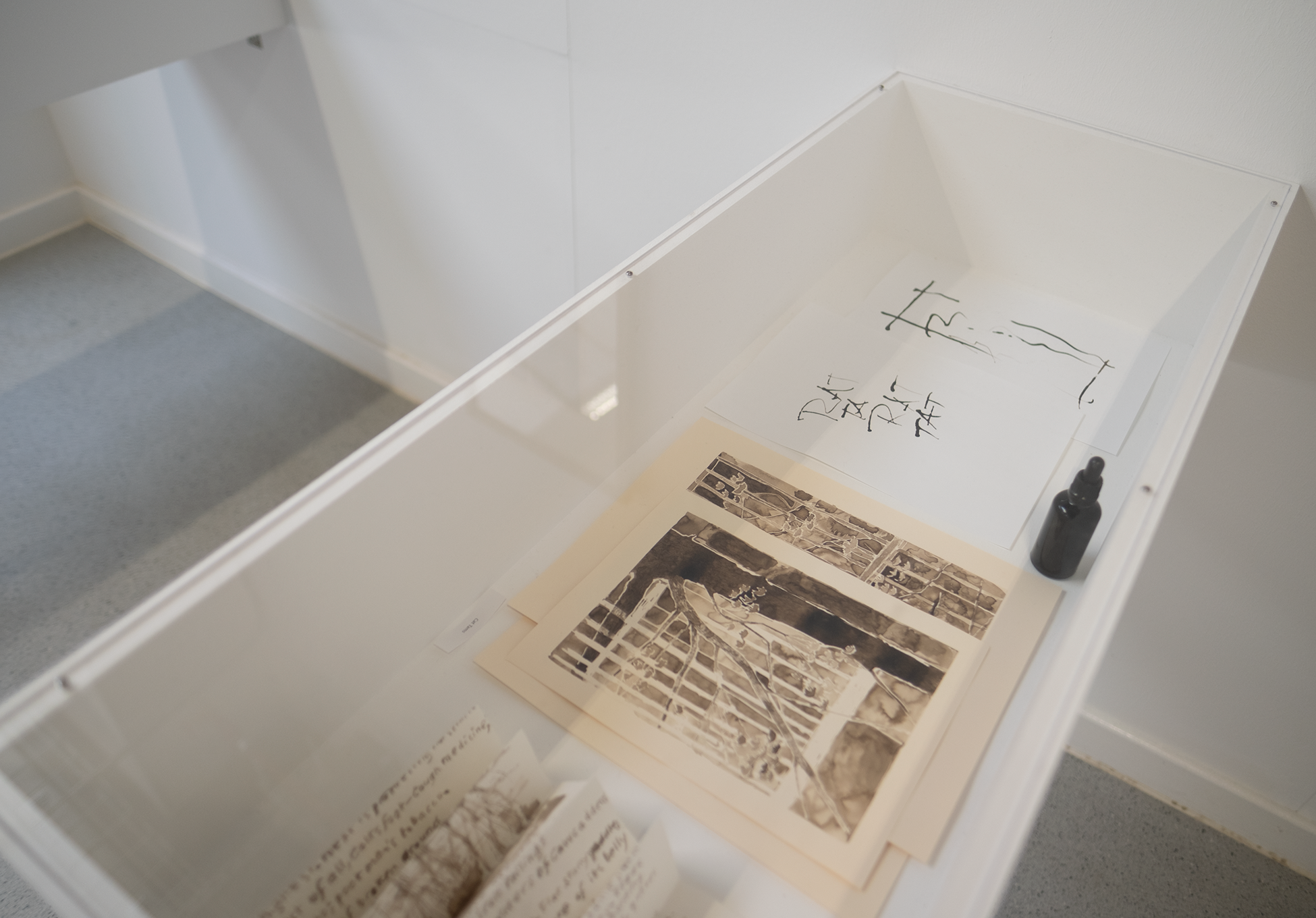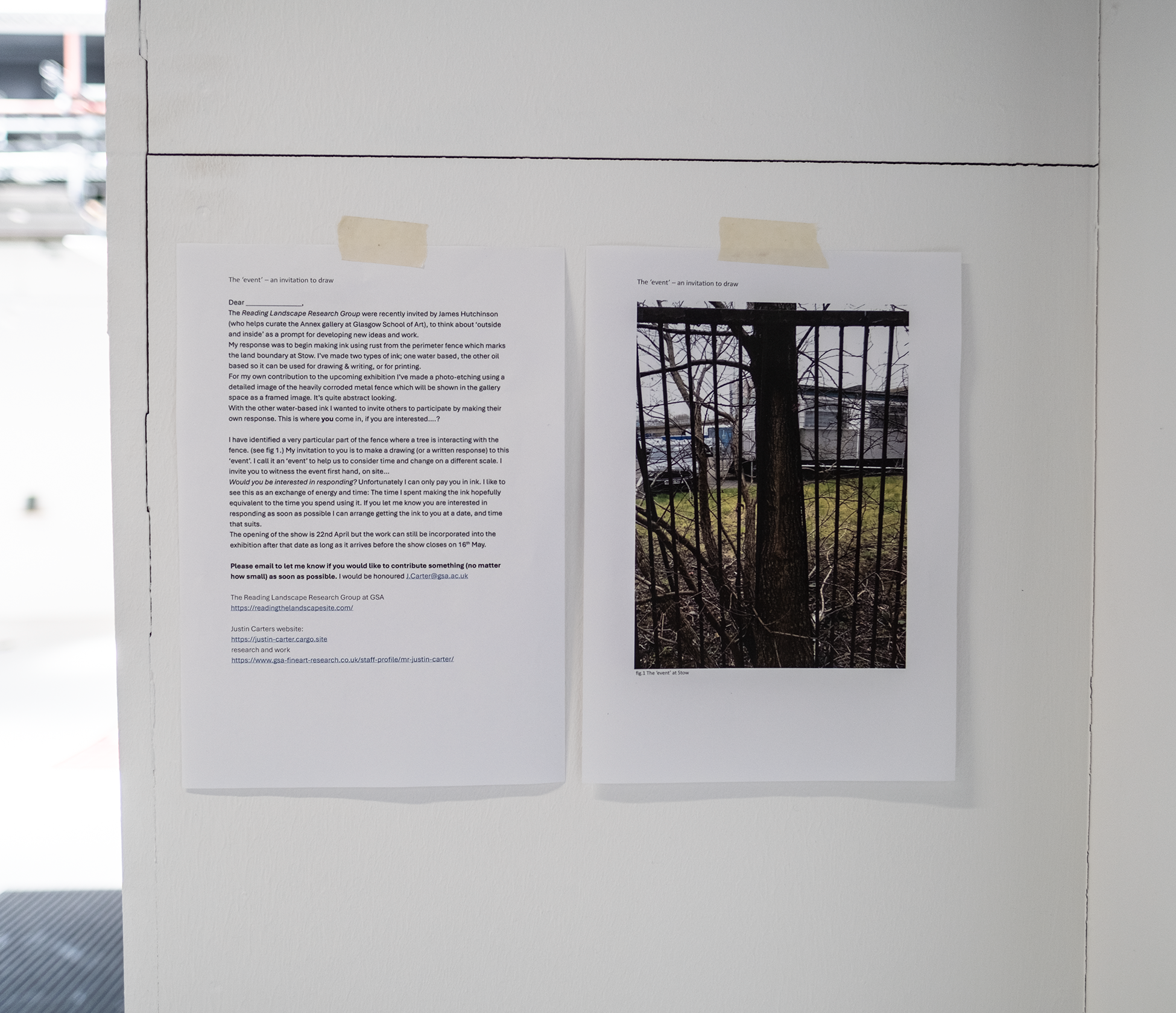 Justin Carter, The Event. 2025. Vitrines, bottle of ink, invitation letter with photograph, ink on paper, dimensions variable. Contributions from invited artists and writers will be added throughout the exhibition – each one invited to respond to the same ongoing ‘event’ on the fence boundary where a tree is forcing its way through the metal railings. [Photo credit: Michael Mersinis]